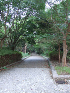 道は多くの木に囲まれていて、直射日光を遮ってくれるので涼しい。そのため、散歩やジョギングをする人が多く見られた。