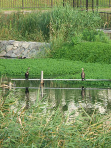 池は、海岸線に沿って東西に長く、隣接する下水処理施設で最終処理された水の回流池を兼ねているそうだ。多くの緑と魚に恵まれているため、鳥の集積地にもなっている。池の周囲を取り囲むように遊歩道、中央部には島が設けられていて、多くの鳥を見かけた。その遊歩道南側からは、明石海峡や淡路島も望める。