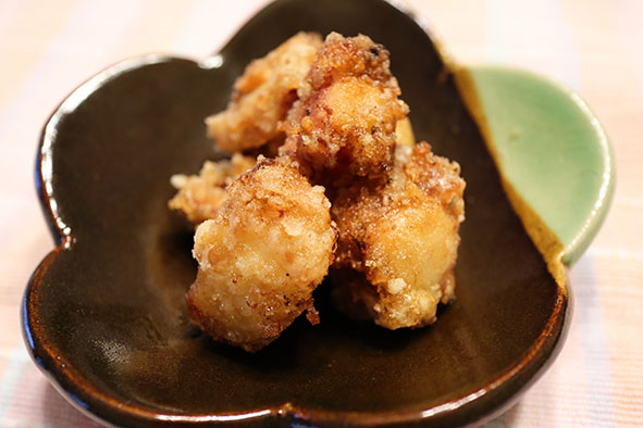 ❷①に片栗粉をまぶして、 180℃の油で揚げる。