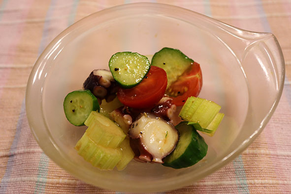 ❶たこを一口大に切り、混ぜ 合わせたAによく絡ませて 15~20分冷蔵庫におく。