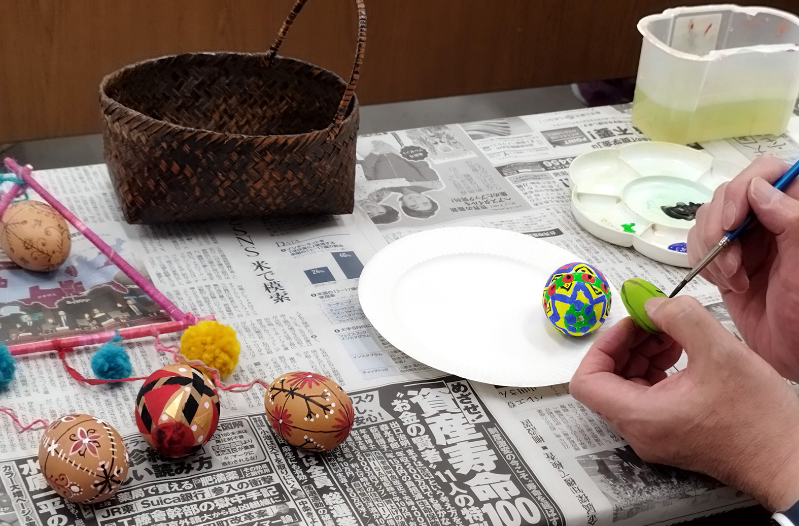 講師はルシノーバ・ナタリアさんで、同プラザに勤務するイワクニェンコ・ナタリアさんが通訳としてサポート。さまざまな色の絵の具が並ぶ中、参加者は中身を抜いた卵の殻に真剣な表情で絵付けを行った。ナタリアさんは「赤いとさかがある鶏は、火事を防ぐ願いを込めて描きます」「太陽は農作物の豊作を願っています」などと説明。描き上げた参加者に「最後に黒色で輪郭を描くと引き立ちますよ」とアドバイスも行った。装飾後はそれぞれの作品に合わせた毛糸を割り箸に巻きつけ、卵を合体させて仕上げた。
