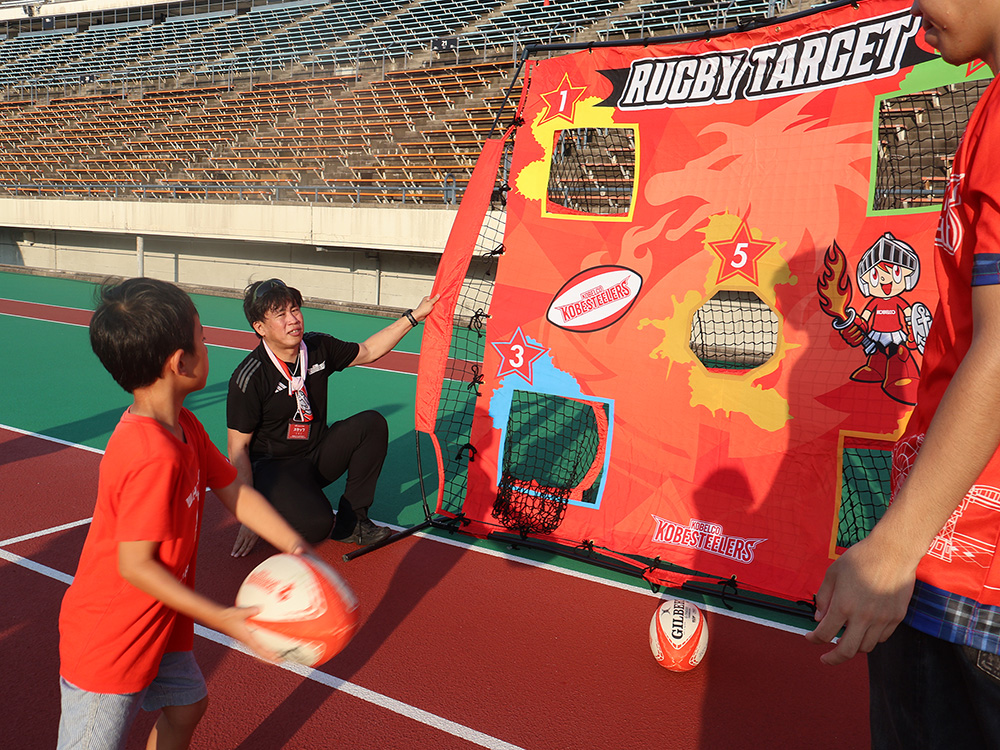 ピッチサイドエリアには、地元の大学や企業が多数出店し、さまざまなスポーツが体験できた。コベルコ神戸スティーラーズのブースでは、公式戦より少し小さなサイズのボールを的に投げ入れるラグビー体験が行われた。毎年家族と祭に参加しているという伊澤律希さん(舞多聞小1)は力いっぱい的に向けてボールを投げ、参加賞のシールをもらって喜んでいた。