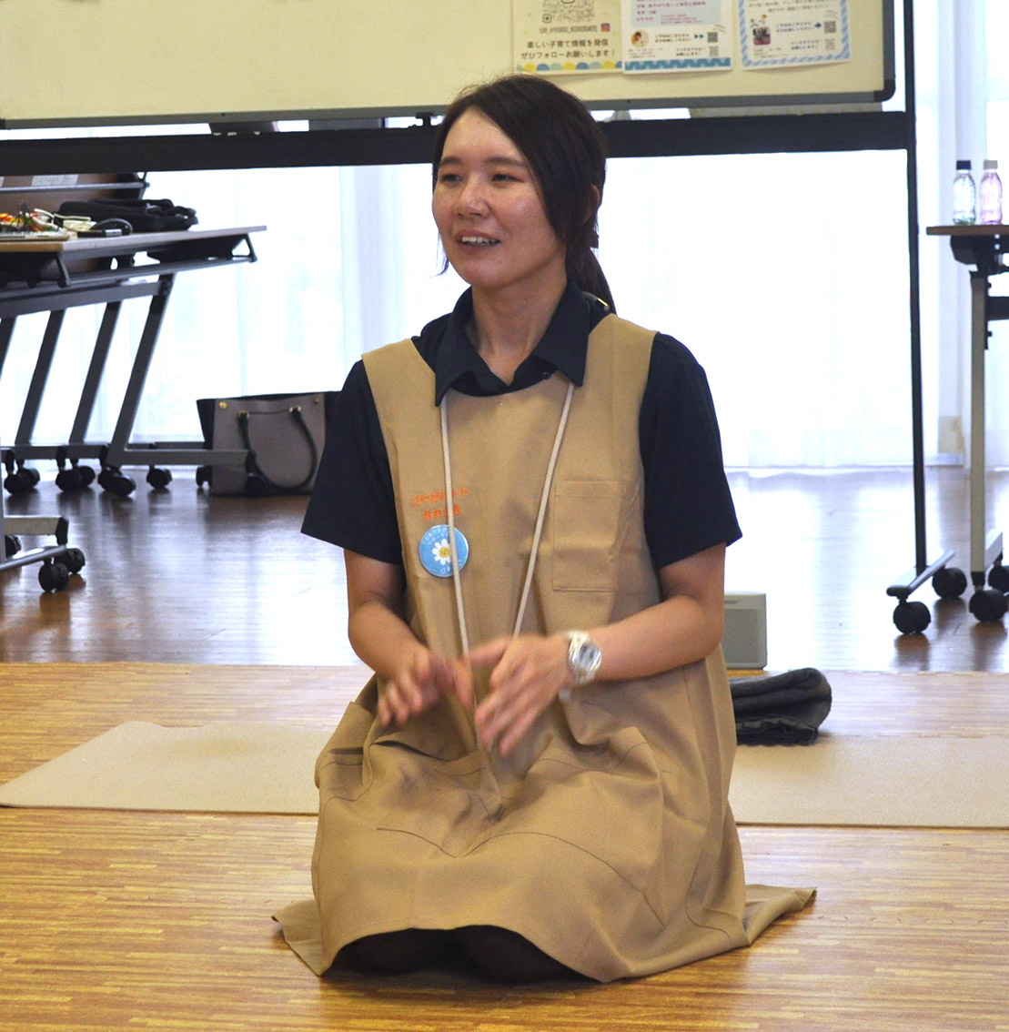 当日は参加者の母親たちから体を動かしたいという声が多くあがり、急遽母親メインのヨガプログラムに変更。「鼻から大きく息を吸って~ゆっくり吐いて~」の掛け声に合わせて少しずつ体をほぐしていく。肩こりや腰痛予防に加え「空気が乾燥すると腸の動きも悪くなる」と便秘改善のポーズや「冬に向けて冷えない体づくりをしましょう」と体を内側から温める効果的なポイントを分かりやすく伝える林さん。参加者たちはだんだん体も温まり汗ばんだ様子。子どもたちは玩具で遊んだり自由に動き回るが、スタッフが見守っているため母親たちは安心してヨガに集中できた。