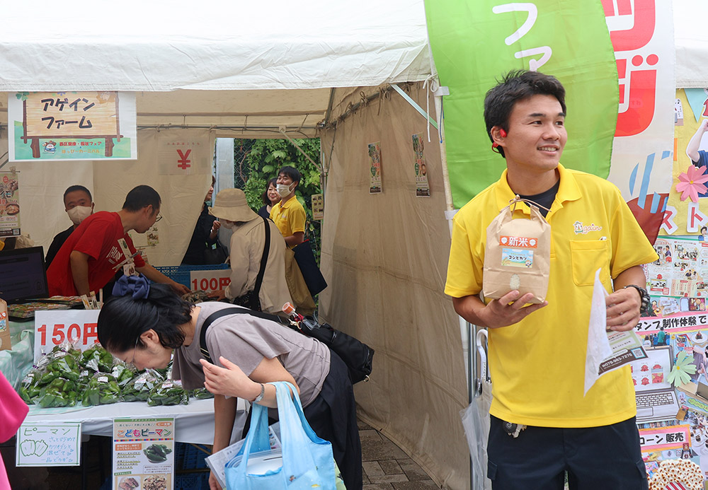 障害福祉サービス事業所の製品販売や活動紹介が行われ、「就労継続支援B型事業所 アゲインファーム」のブースでは、利用者が育てた米や野菜を販売し盛況だった。同事業所は西区内にある農場で年間50種の野菜を栽培している。管理者の田中喜陽さんは「利用者さんごとの特性を生かした作業をしていただき、皆で協力して野菜を作っています」と話した。