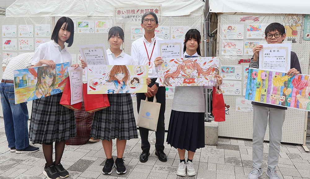 ステージでは赤い羽根共同募金・募金箱デザインコンテストの表彰式が行われた。201点の応募作品の中から5点が最優秀賞に選ばれた。最優秀賞を受賞した森貞明紗さん(太山寺中3)はカラーマーカーで平和をコンセプトに描き、同じく最優秀賞の木村優愛さん(同中3)は色鉛筆で募金をする少女と鳥を描いた。