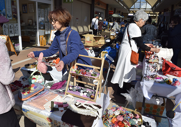 同プラザの通路では「オープンフリーマーケット」が開かれた。苺の苗、大小さまざまなぬいぐるみ、ハンドメイドのバッグ・ポーチ・ストラップなどを販売するブースがあり、掘り出し物やお目当ての物がないか買い物を楽しむ来場者の姿があった。