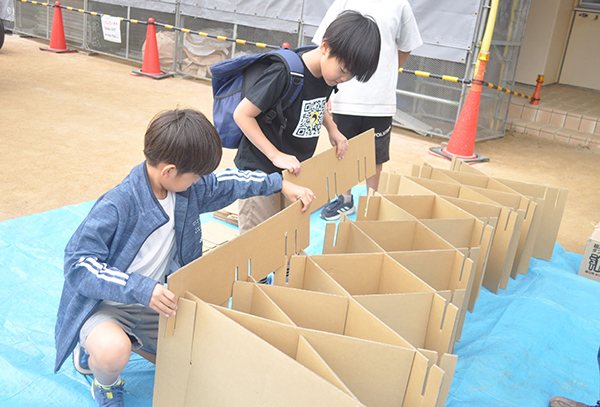 簡易ベッドづくりのブースでは、蛇腹状になっている段ボールを広げてパーツを順番に挟み込み、天板を乗せて完成。組み立てたベッドに寝転がった参加者は「思っていたより頑丈でビックリした」とその強度に驚いていた。毛布を使った担架づくりでは垂水消防団員から毛布がずれないコツを教わり、参加者たちは作った担架に人形を乗せて運ぶ訓練もした。「けが人が出た場合、物干し竿と衣類でも簡易担架を作ることができる」と説明を聞いた城間京香さん(高丸小5)は「身近なもので担架ができると知ったので家族が倒れた時は実践したい」と話した。