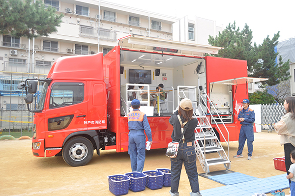 ほかにも水消火器を使って火に見立てた的を倒したり、〇×クイズでは「神戸市内の火災で一番多い原因は電気関係?(答〇)」「天ぷら油火災が発生した時は水をかける?(答×)」など垂水消防署から10問出題。消防車の展示ブースもあり、近藤大智さん(高丸小2)は防火服を着て笑顔で座席に乗り込んだ。