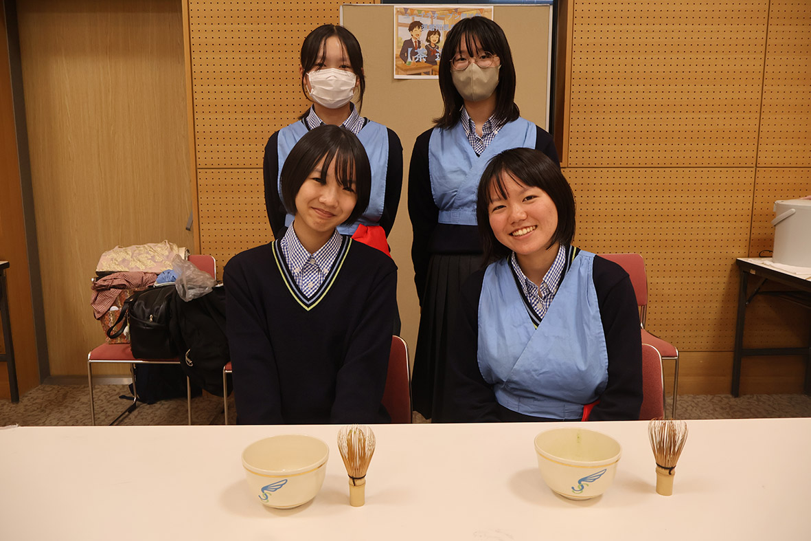 茶道部はエプロンを着け、懐紙や袱紗を携えお茶を点てて来場者をもてなした。同部は週1回外部講師を学校に招き、茶道室で稽古を行っている。部長の齊木日鞠さん(2年)は「高校に入るまで茶道はやったことなかったけれど、やってみたら楽しかった」と話した。