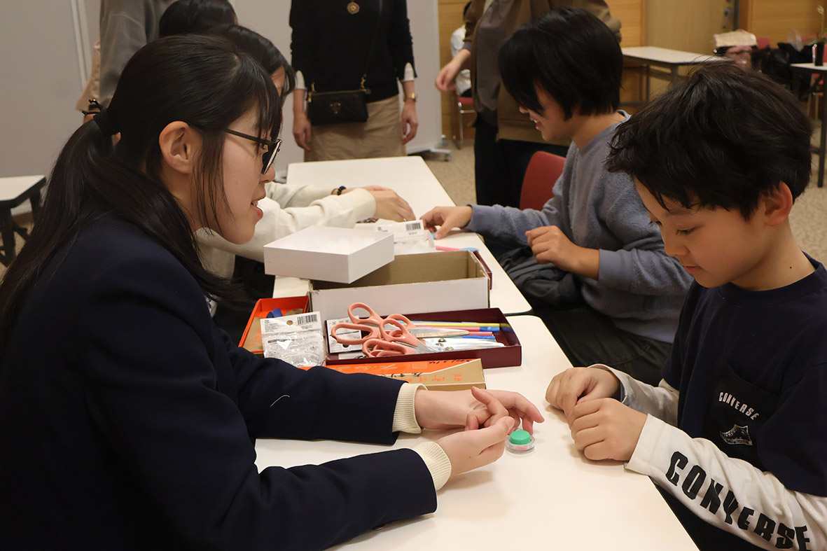 家庭科部はクルミボタンのヘアゴムやキーホルダー作りのワークショップを行った。クルミボタンは用意された布の中から好きな布を選び裁断して、ボタン型にはめ込むと完成。クルミボタンの製作は新入生が最初に取り組むもので、すべての部員が工程を熟知しているため、ワークショップにしてみようと生徒から提案があったという。同部は25人が在籍し(取材時)、部活動中に作成した手芸作品を文化祭で販売もしている。また、料理が得意な部員も多く、レシピコンテストに応募するなどのチャレンジもしている。部長の庄司和さん(2年)は幼い頃から手芸が好きで、中学校でも家庭部に所属。最近は編み物で花束を作ることが楽しいと言い「女子高生の間で編み物が流行っていて、友達から作り方を教えてと頼まれることも多いです」と話した。