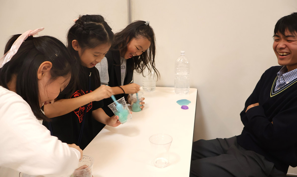 サイエンス部は「スライム作り」を行った。スライムの材料はグアガム、ホウ砂、水、体温で色が変わるインク。参加した子どもたちは楽しそうに混ぜ合わせてスライムを作っていた。普段の活動は、各自がやってみたい科学実験を行ったり、ドローンを飛ばして動画を作成したり、夏休みには地域の小学校や児童館で実験を織り交ぜたイベントを行ったりしているという。部長の西林真幌さん(2年)は来場者との交流を楽しみ、笑顔を見せていた。