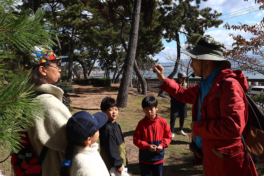 下山し須磨浦公園を散策。よこお自然塾の髙畑正さんによる松の木の説明「マツ類は1年に一節ずつ伸びるので、地面から何節あるかを数えると年齢が分かります。この松は8歳ですね」に、「同い年や」と応える参加者もいた。また、リスが食べた後の松ぼっくりを「このエビフライみたいなの何かわかる?」と問いかけてから説明すると、子どもたちは驚いた様子で見入っていた。