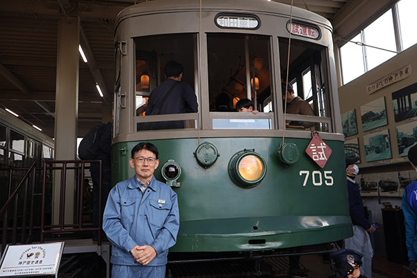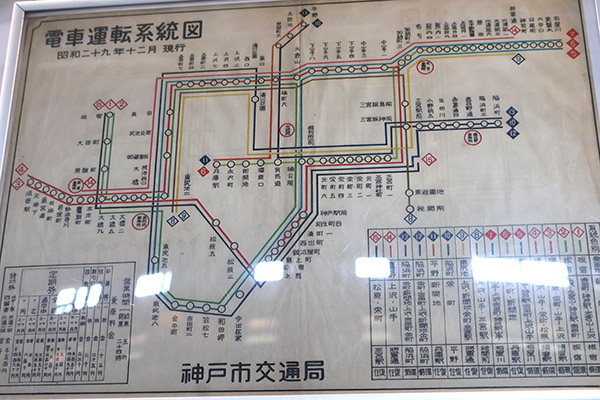 市電庫では昨年2月に「神戸歴史遺産」に認定された市電車両の見学ができた。1971年3月まで神戸市内を走っていた神戸市電700型(705号車)、800型(808号車)の2両と関連機器が保存されている。かつて電気局(のちの交通局)が運営していた路面電車(市電)は1917年より運行開始、全盛期には35・6㎞の路線網を有した。運転士と車掌が2人1組で乗車し、車掌は入口に立ち、乗車料金(1971年当時大人25円、子ども15「円)を徴収した。車内は床・窓枠・つり革を支える棒に至るまで木材で作られており、静態保存する4両の内2両が同基地で保存されている。廃線後、一部の車両は広島電鉄に引き継がれたが58両は漁礁として須磨沖に沈められた。それから50年後の2022年に元市職員で水中写真家の宮道成彦さんによって引き上げられた窓ガラスやつり革が、車両とともに展示されている。ホウロウで作られた駅名の看板などが一般の鉄道ファンから寄贈されるなど、市電を愛した多くの人の手によって維持されている展示だと市電庫の開設に携わった秋田幸夫さんは語った。