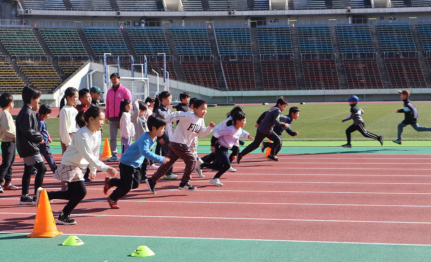 2回に分けて行われた「かけっこ教室」では、小学1~4年生の子ども72人が楽しく走り方のコツを学んだ。コーチを務めたのはJAAF公認ジュニアコーチの和田木湧さん。元十種競技の選手であらゆる陸上競技に精通し、水・木曜日には、総合運動公園補助競技場で陸上教室のコーチも務めている。まずグラウンドを1周走り、ゲーム形式のウォーミングアップで身体をほぐした。