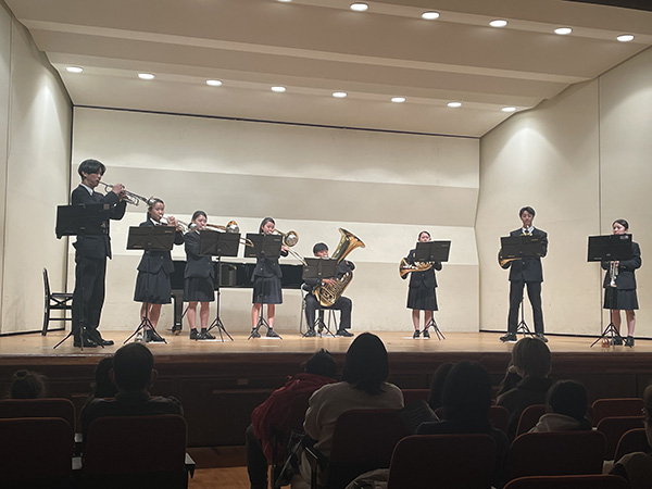 トークタイムでは、中山さんと、同部のメンバーから髙妻実莉さんと鷺澤優人さんが参加し、事前に集められた「練習は毎日何時間?」「どんなモチベーションで練習を?」「練習と勉強の両立はどうしている?」「どんな風に息抜きする?」などの質問に丁寧に回答していった。中山さんは「海外のコンクールに挑戦した時には落ち込んで練習に手がつかないこともあった」と話し、辛いこともあるが、前を向きながら頑張っているという。勉強と練習の両立について、チューバを吹く鷺澤さんは「通学に電車とバスで1時間かかるが、その時間を有効に活用している」と話した。煮詰まってくると体を動かしてリフレッシュすることが多いという。髙妻さんは「高校入学前に同校のマーチングを見て、憧れて入学・入部した。123名で動くマーチングバンドはとても迫力があるので、ぜひ定期演奏会を見に来てほしい」と観客にアピールして締め括った。