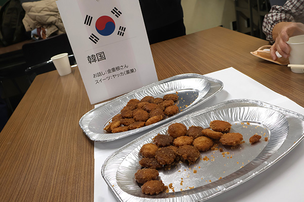 金重根さんは韓国のヤッカ(薬菓)を紹介。小麦粉にごま油、ハチミツ、シナモン等を混ぜて揚げ、甘い蜜につけたお菓子。金さんは「これはかつて宮廷料理や祭事の時に食べられていた高級なものでした。現在は一般的に食べられるようになっています」と説明した。来場者は各テーブルを回って作り方や、各国の風習を聞いたりしながら、おいしいスイーツを楽しんだ。 和室では公民館の茶道講座を担当している片山喜代美さんが抹茶を点て、和菓子を提供。初めて茶道を体験する参加者が貴重な機会を喜んだ。
