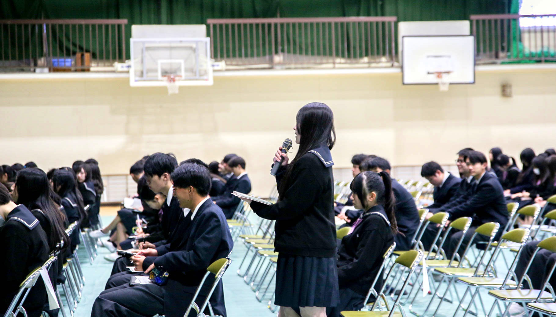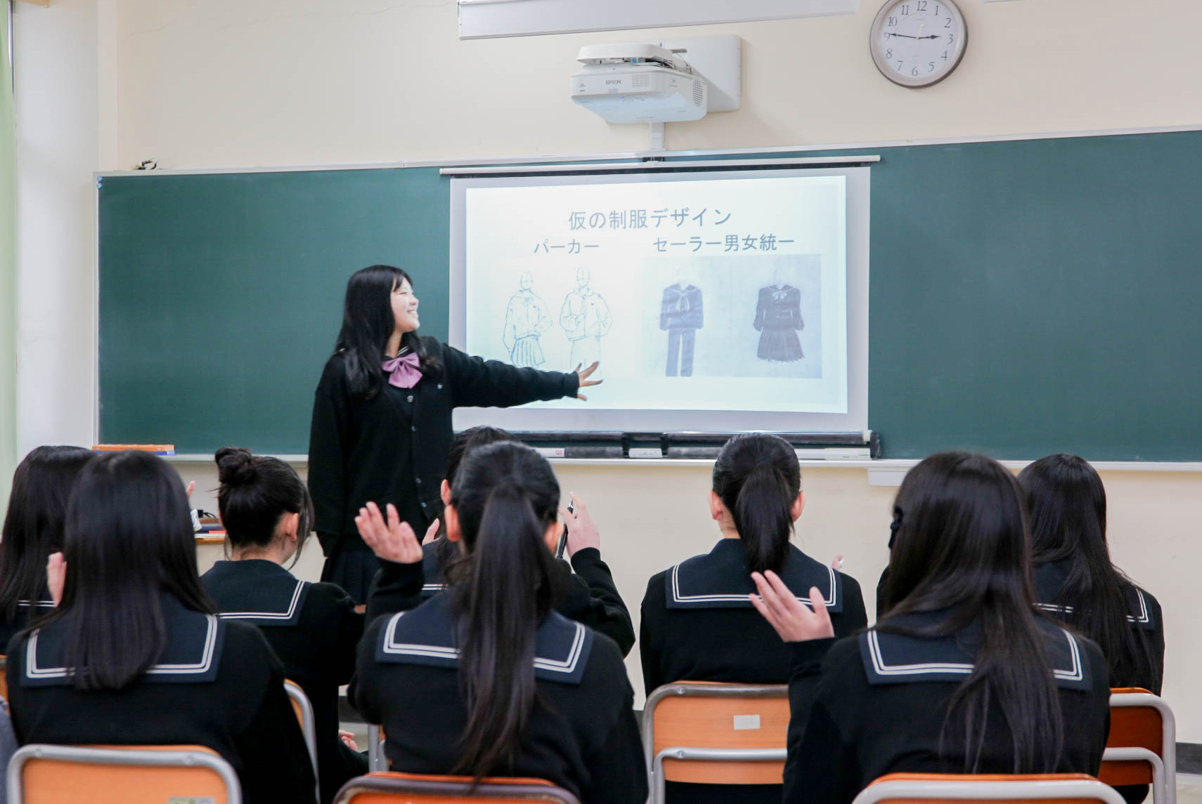 リーガルマインド特色類型の1年生は、SDGsをテーマに探究。「貧困地域に質の高い教育を」と題した発表を行ったグループは、実際にアフリカ・ルワンダのスラム街を訪れた経験のある市内在住のカメラマンを訪ねてインタビューを行った。リアルな声をヒントにインターネットで収集した情報から「貧困の解決には飢餓の対策以上に教育の質の向上が鍵となる」と考察。発表に臨んだ稲葉萌花さん、平野瑠音( るのん)さんは「本番前の中間発表では時間が足りず、スライドを大幅に絞り込む作業に苦戦した 」と話しながら、やり切った後の晴れやかな表情を見せた。